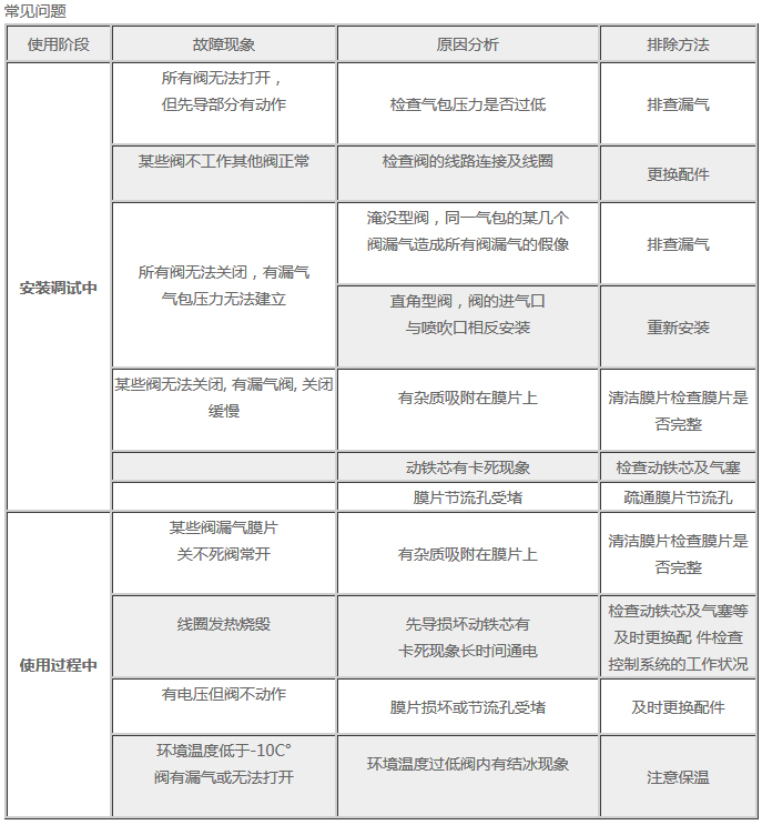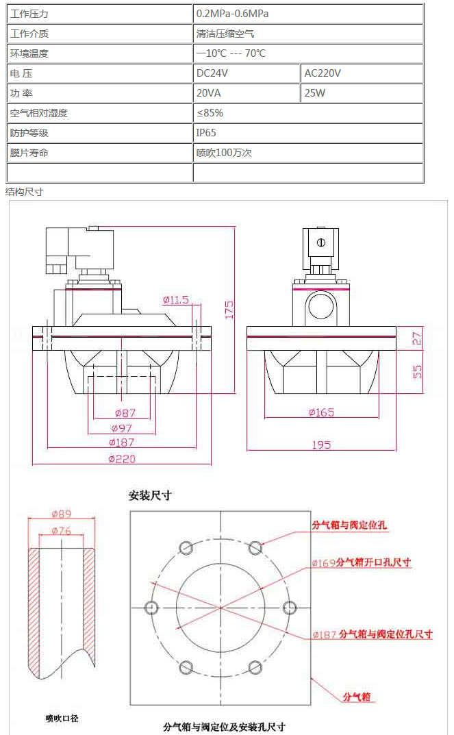 6. 該閥與氣包及噴吹連接管的密封件適用溫度為-10℃~70℃。如需高溫密封件,請訂購時另行注明。