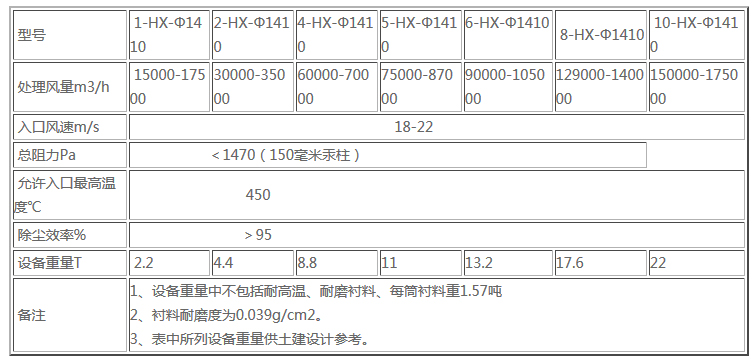 1、本除塵器可由單筒及數(shù)個單筒組合使用,單筒處理風量為15000-18000m3/h。